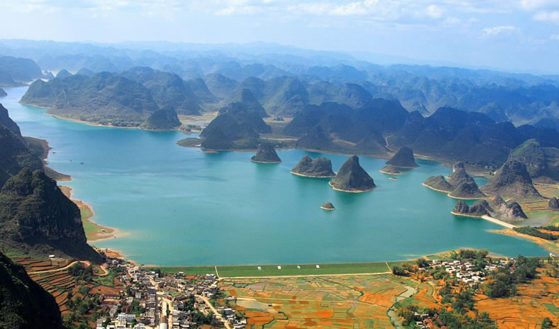 渠洋湖,是一個大型的喀斯特高原湖泊水庫。庫區(qū)總?cè)萘?228平方米,水質(zhì)優(yōu)良,有大小島嶼十多個,沿岸有海拔一千多米的岜行山,以及掩映在綠樹翠竹當中的幾百個壯族干欄式村寨。