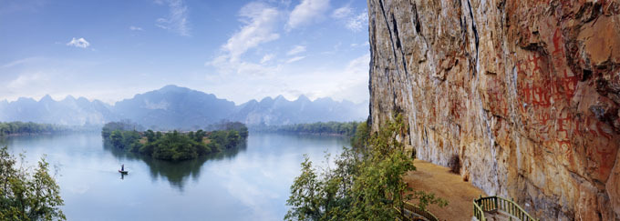 位于縣城西北25千米的明河畔,以其古老神奇的巖畫而聞名中外;ㄉ綆r畫是左江流域巖畫中的代表,也是世界同類巖畫中單位面積最大、畫面最集中、內(nèi)容最豐富、保存最完好的一處巖畫,被譽為是壯族文化的瑰寶。 1988年,花山巖畫被國務(wù)院列為全國重點文物保護單位。1998年,以花山巖畫為中心的花山風(fēng)景區(qū)被定為國家級風(fēng)景旅游名勝區(qū),成為與桂林漓江、桂平西山齊名的廣西三大國家級風(fēng)景旅游名勝區(qū)之一。2000年開始,國家文物局實施花山巖畫保護計劃,對保護巖畫進行深入研究。2003年6月,寧明縣啟動花山巖畫申遺工作。2004年11月,國家建設(shè)部把寧明縣花山巖畫列入《中國申報世界遺產(chǎn)預(yù)備名單》。