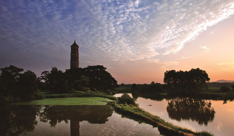 蓉峰塔位于縣城北,始建于清朝道光初年(1821年),塔高40余米,共五層,為八棱青磚結(jié)構(gòu)。遠(yuǎn)眺寶塔猶如文筆豎立,每當(dāng)夕陽西下,塔尖猶如筆尖,塔影延及湖中,形同秀筆蘸墨。
