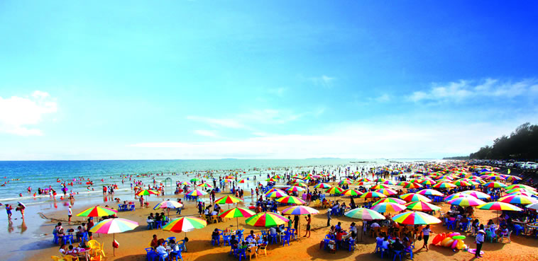 金灘,位于京族萬尾島的南邊,全長13公里,與越南的風景名勝區(qū)萬柱島隔海相望。金灘沙細、坡緩、水清、浪平,且無海藻、無鯊魚、無污染。沙灘由海岸緩緩斜入海中,是集陽光、沙灘、海水于一身的天然“三·S”海濱浴場。岸上有20多公里長的椰樹、木麻黃觀光林帶。金灘空氣氧離子含量是內(nèi)陸城市的500~1000倍,最高氣溫33℃、最低氣溫6℃,年平均氣溫在20℃~23℃之間。