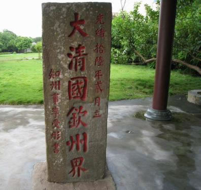 1885年6月9日,清政府與法國在天津簽定的《中法越南條約》規(guī)定,兩國邊界自竹山起,循北侖河出?谀媪鞫,以河心為界線。防城港市與越南的邊界線,從竹山的北侖河口至峒中的北崗隘,長200多公里,全段以石碑為標志,共立1至33號界碑。竹山界碑是清光緒十六年(公元1890年)所立的第一塊界碑,故稱大清國一號界碑。100多年來,竹山一號界碑歷盡滄桑,屹立于北侖河口巋然不動,顯示了中國領土的神圣不可侵犯,故竹山一號界碑具有較高的歷史價值和現(xiàn)實意義。