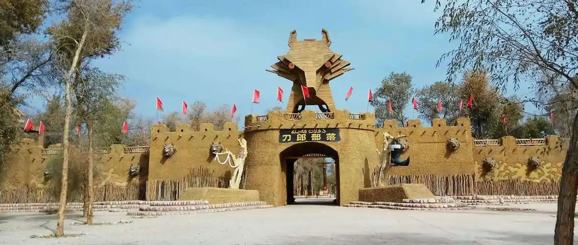 刀郎部落,位于新疆維吾爾自治區(qū)阿克蘇地區(qū)阿瓦提縣玉滿閘口胡楊林區(qū),距阿克蘇市58公里、縣城18公里,占地面積8300畝。景區(qū)以5000余畝千年原始胡楊林為生態(tài)背景,完整呈現(xiàn)刀郎人建筑、飲食及民俗文化,集中展示刀郎木卡姆、刀郎麥西熱甫等8項(xiàng)國(guó)家級(jí)和自治區(qū)級(jí)非物質(zhì)文化遺產(chǎn),其中“刀郎演唱組合”保持著最大年齡民間歌舞組合的大世界基尼斯紀(jì)錄。核心功能區(qū)包含民俗展館、千年胡楊區(qū)、鴕鳥養(yǎng)殖園區(qū)等七大板塊,復(fù)原刀郎人傳統(tǒng)居所與勞作工具,設(shè)有傳統(tǒng)手工藝作坊和勇士競(jìng)技場(chǎng),每日開(kāi)展刀郎麥西熱甫展演、民俗婚禮體驗(yàn)及摔跤、叼羊等傳統(tǒng)體育活動(dòng)。2025年入選非遺進(jìn)景區(qū)“五好”案例名單,通過(guò)非遺傳承人駐場(chǎng)表演、慕薩萊思釀造工藝展示及沙雕主題公園等特色項(xiàng)目,形成生態(tài)觀光與民俗體驗(yàn)深度融合的旅游模式。景區(qū)內(nèi)保留狩獵場(chǎng)景、農(nóng)民畫長(zhǎng)廊及高空輪轉(zhuǎn)秋千表演,配套沉浸式互動(dòng)體驗(yàn)和文創(chuàng)開(kāi)發(fā)體系,實(shí)現(xiàn)刀郎文化的活態(tài)傳承。