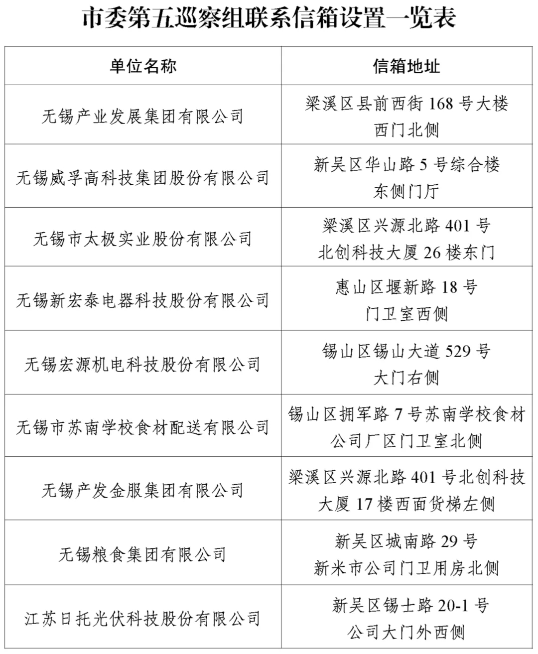 市委巡察公告 根據(jù)市委巡察工作領導小組統(tǒng)一部署,市委第五巡察組對無錫產(chǎn)業(yè)發(fā)展集團有限公司黨委開展常規(guī)巡察,時間為2024年4月25日至7月5日。根據(jù)有關規(guī)定,市委巡察組主要受理反映無錫產(chǎn)業(yè)發(fā)展集團有限公司黨委領導班子及其成員、下一級主要負責人以及相關重點崗位干部(含已離退休、已調(diào)離)的來信來電來訪。其他不屬于巡察受理范圍的信訪問題,將按規(guī)定轉交有關部門認真辦理。市委巡察組受理信訪時間截止到2024年7月2日。 巡察期間設專門舉報電話:18800559869,可同時接收短信、微信,接聽時間為工作日8:00-18:00; 郵政信箱:江蘇省無錫市0450號郵政信箱; 郵政編碼:214031; 聯(lián)系信箱:無錫產(chǎn)業(yè)發(fā)展集團有限公司(梁溪區(qū)縣前西街168號)大樓西門北側。 特此公告。 中共無錫市委第五巡察組 2024年4月25日 ![]() ![]() |