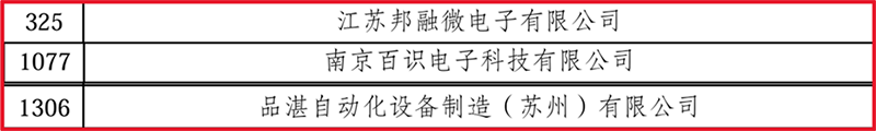 近日,江蘇省工信廳發(fā)布了《關(guān)于江蘇省2024年度省級專精特新中小企業(yè)(第二批)和 2021年度省級專精特新中小企業(yè)復(fù)核通過企業(yè)名單的公示》,江蘇邦融微電子有限公司、南京百識電子科技有限公司、品湛自動(dòng)化設(shè)備制造(蘇州)有限公司3家創(chuàng)投集團(tuán)被投企業(yè)入選第二批專精特新中小企業(yè)。