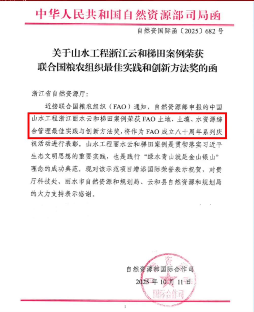 近日,中國(guó)山水工程浙江云和梯田項(xiàng)目榮獲聯(lián)合國(guó)糧農(nóng)組織最佳實(shí)踐和創(chuàng)新方法獎(jiǎng),并將作為聯(lián)合國(guó)糧農(nóng)組織(FAO)成立八十周年系列慶;顒(dòng)進(jìn)行表彰。
