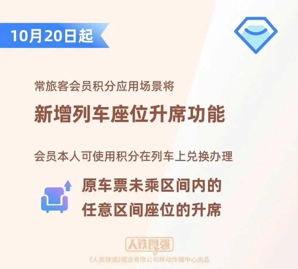 10月20日起,常旅客會(huì)員積分應(yīng)用場(chǎng)景將新增列車(chē)座位升席功能,會(huì)員本人可使用積分在列車(chē)上兌換辦理原車(chē)票未乘區(qū)間內(nèi)的任意區(qū)間座位的升席。乘車(chē)途中,會(huì)員可掃描座椅扶手上的“鐵路暢行”二維碼登記升席需求,也可直接聯(lián)系列車(chē)工作人員辦理;接到旅客升席需求后,列車(chē)工作人員將根據(jù)列車(chē)座席空余情況及時(shí)進(jìn)行辦理。